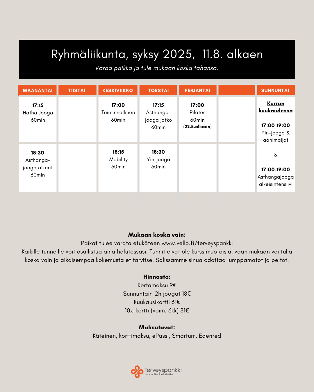 Ryhmäliikuntatunneille voit tulla mukaan koska tahansa, tunneille tulee tehdä sähköinen paikkavaraus.